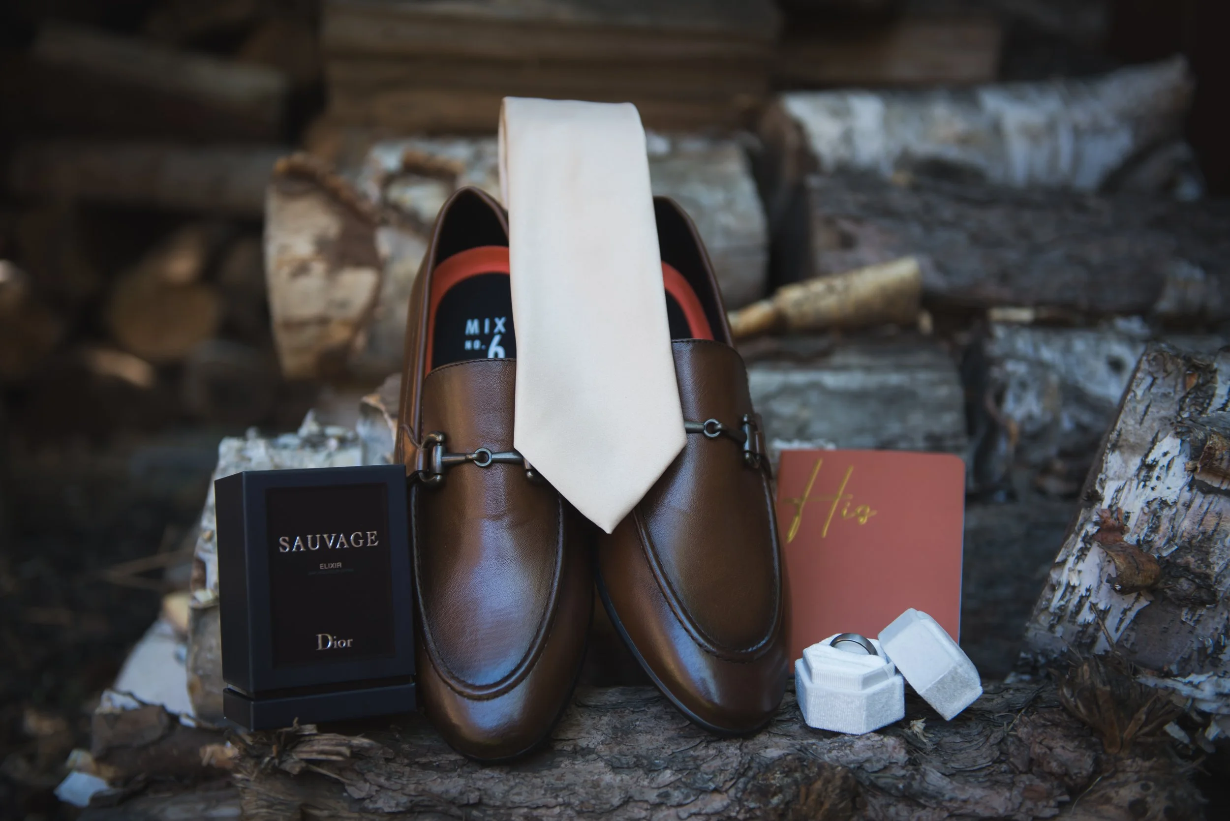 A carefully arranged display of his essentials—rich brown leather shoes, a sleek ivory tie, and a classic bottle of Dior Sauvage—set against a backdrop of stacked wood, spoke to his refined taste and the wedding’s rustic theme. This simple yet elegant arrangement was a testament to the groom’s attention to detail.